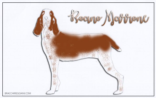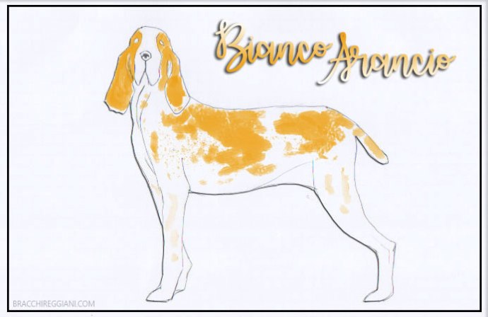 Lo standard del bracco italiano contempla infatti solo 2 megacolorazioni: l’arancio [melato-arancio e bianco-arancio] e il marrone [bianco-marrone e roano-marrone].