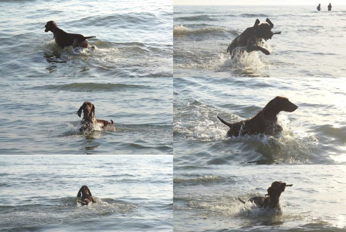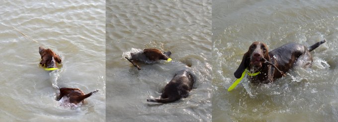 Con all’attivo un’abbondante socializzazione intraspecifica, interspecifica, atmosferica, inserimento nell’ambiente expo, venatorio, di agility, contavamo finora un’assenza importante: il consolidamento della confidenza con l’elemento acqua, fondamentale in caso di riporto da un qualche laghetto in Toscana…ma più che altro perchè non vedo l’ora di comprarle il bikini.