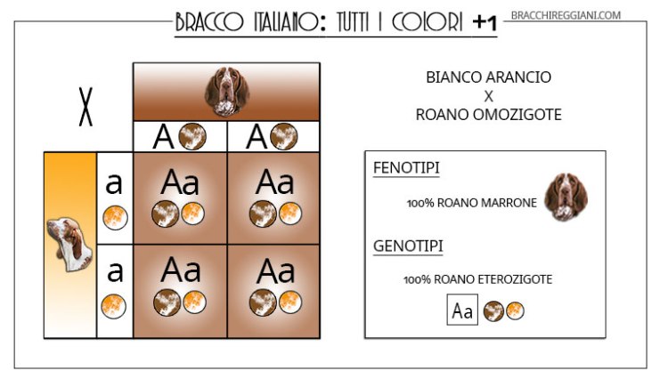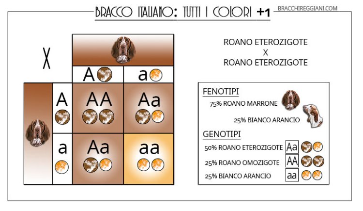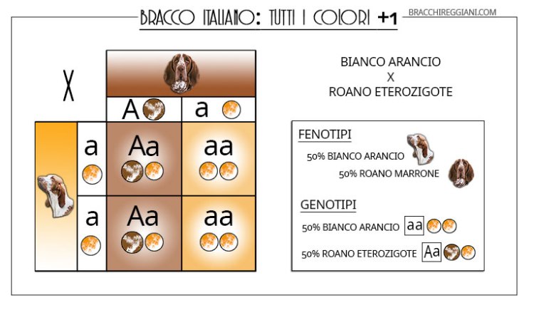 Dall’amore tra un bianco arancio e un roano eterozigote (cioè che pur non manifestandoli, perchè il marrone è dominante sull’arancio, è portatore dei geni recessivi) potranno nascere sia cuccioli bianco arancio, sia cuccioli roani eterozigoti.