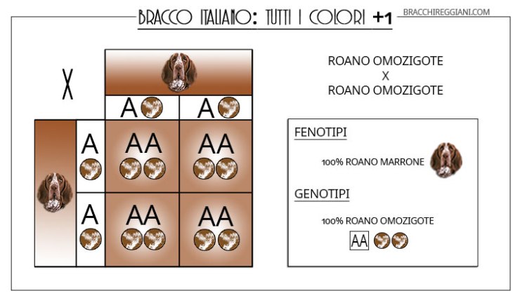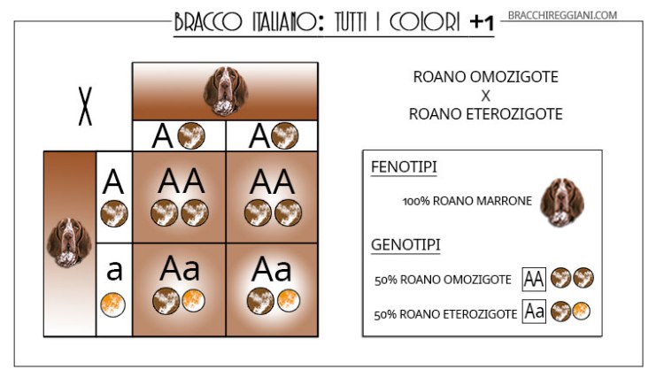Invece dall’incontro tra un bianco arancio e un roano omozigote, com’era per esempio il nostro Rosco di Montericco, otterremo solo cuccioli roani eterozigoti che, in un accoppiamento con un altro roano eterozigote, potrebbero di nuovo dar vita a bracchetti bianco arancio.