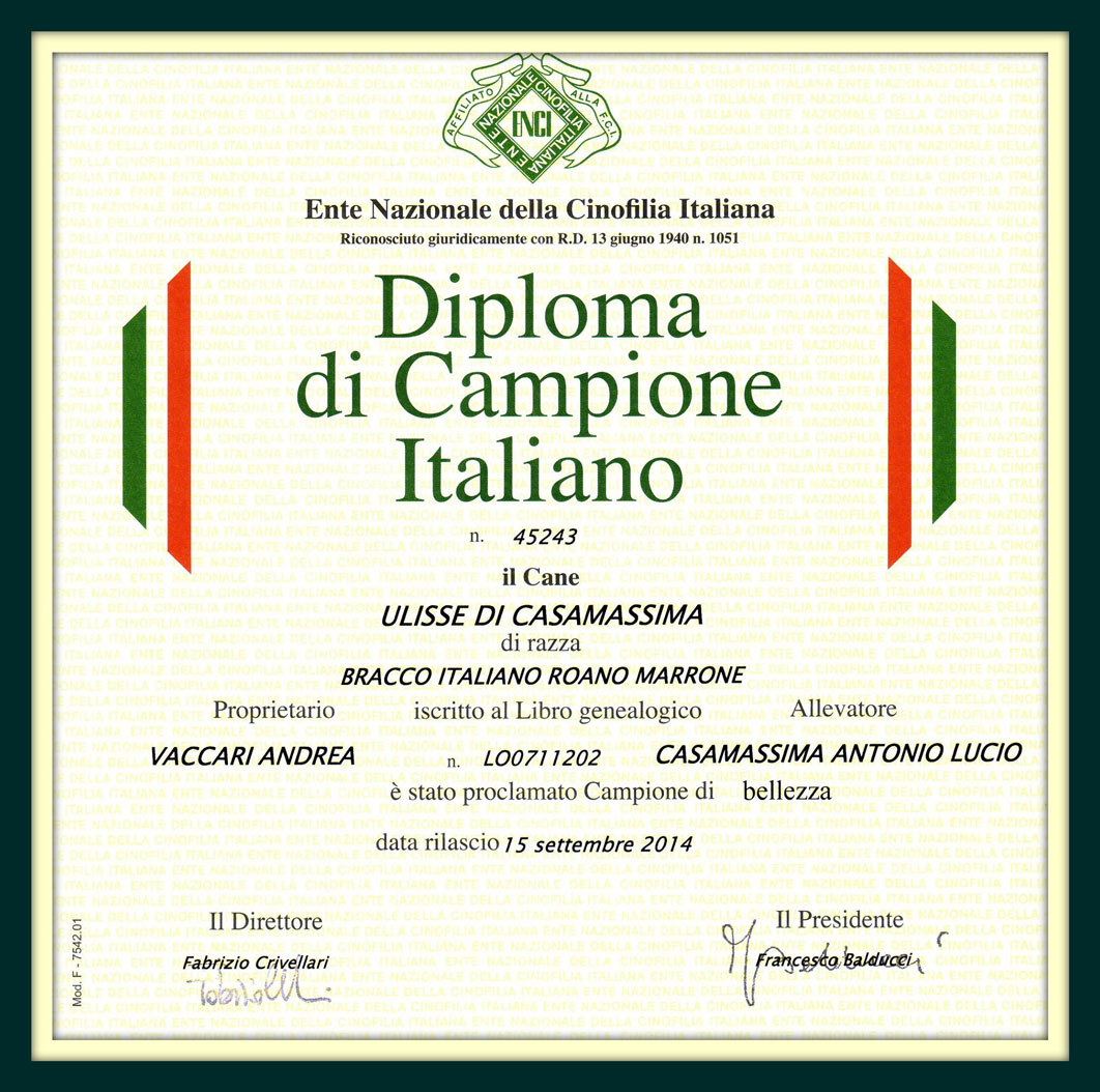Quanto dimostrato sui terreni di caccia abbinato ad una costruzione morfologica eccellente – di cui sono prova i numerosi C.A.C. riportati in raduni di razza – hanno fatto sì che Ulisse catalizzasse su di sè l’attenzione di alcuni allevatori che attraverso diverse monte, hanno portato (o riconfermato) la sua linea di sangue nei propri allevamenti: su tutti quello di Casamassima, di Montericco, di Witigenove e Compatriota di Bonfini.