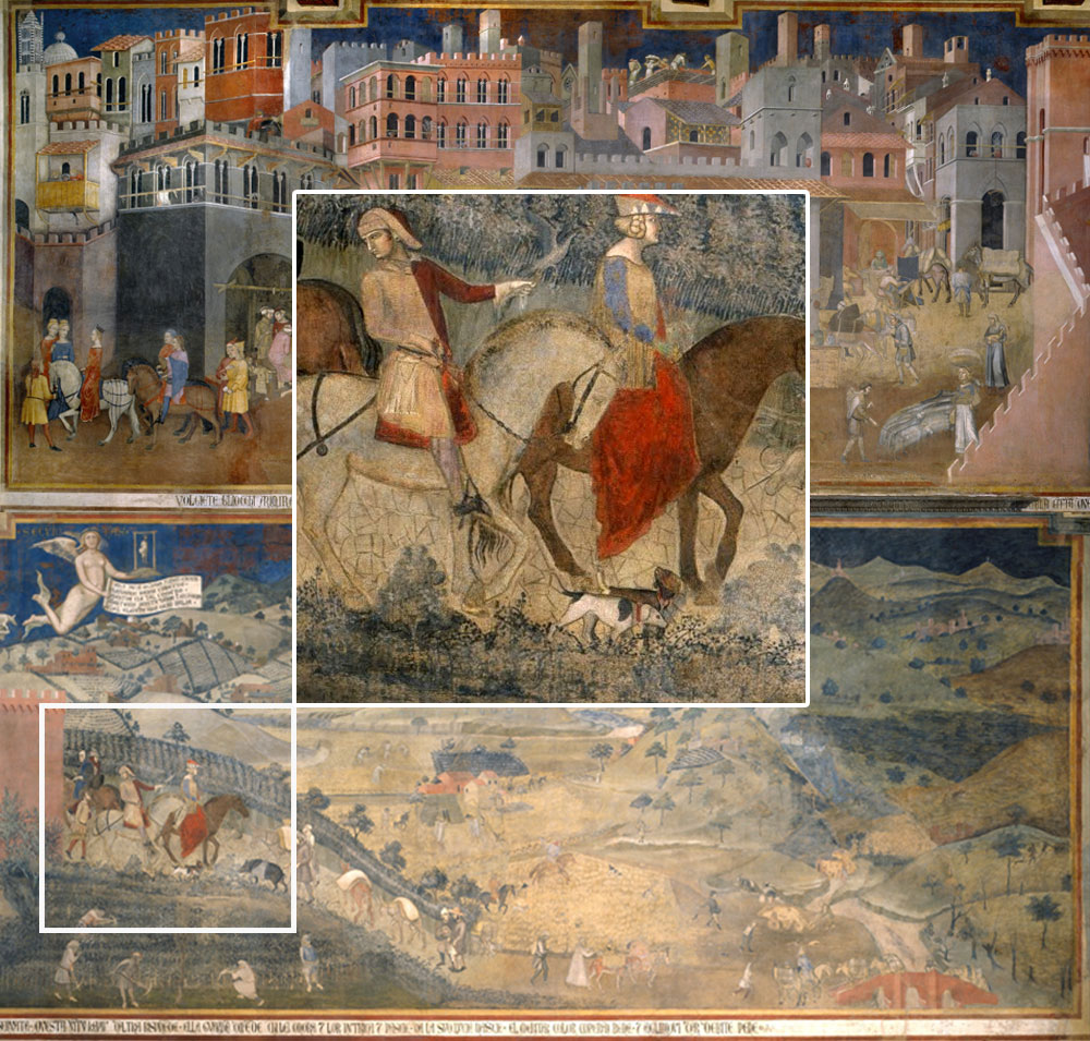 Siena, Palazzo Pubblico, Sala del Consiglio dei Nove o della Pace.In questo affresco la caccia è rappresentata tra l’altro, da un cane bianco e marrone a pelo corto in ferma davanti a un falconiere che tiene sul pugno guantato l’accipitrino, pronto a levarsi non appena il selvatico fermato si paleserà col volo. Alberto Chelini – I nostri cani 1975